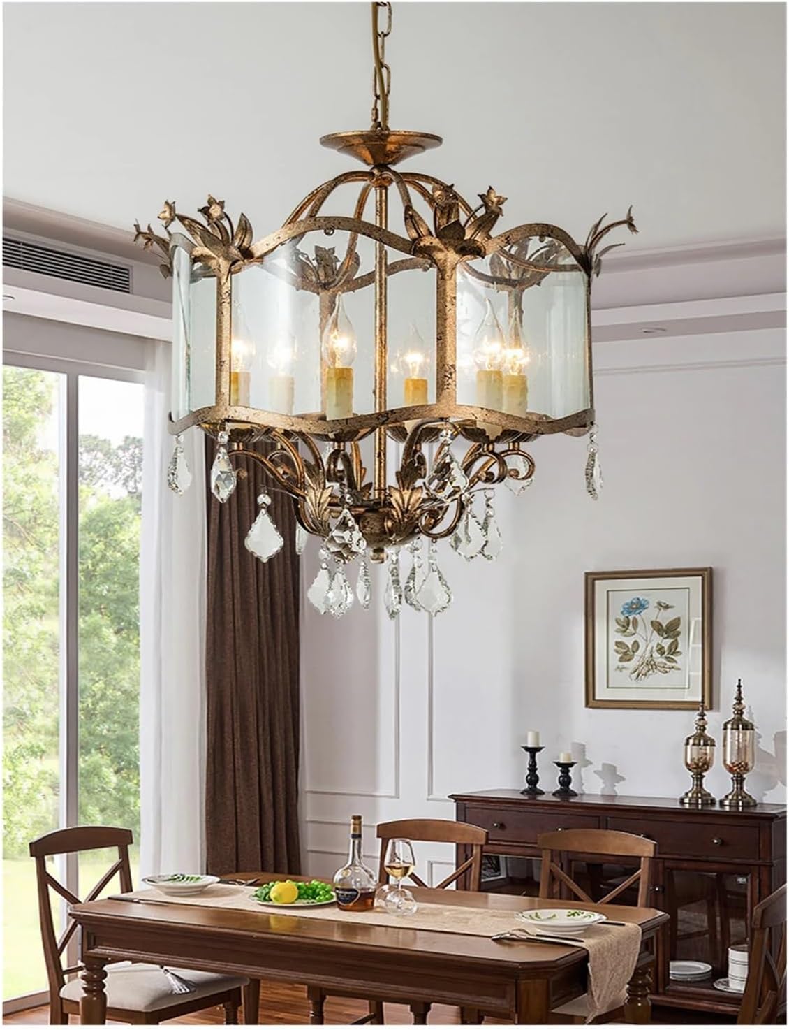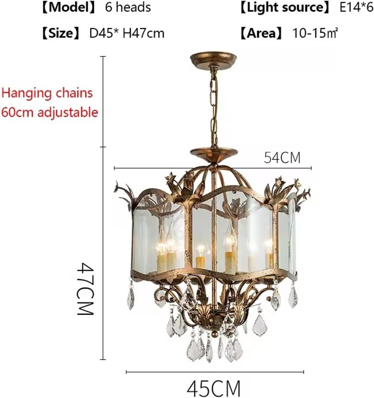 Light source: E14Material: Iron + CrystalSize: D30CM*H47CM/D45CM*H47CMApplicable range: 5-15㎡Application scenarios: Dining room, bedroom, living room, etc.